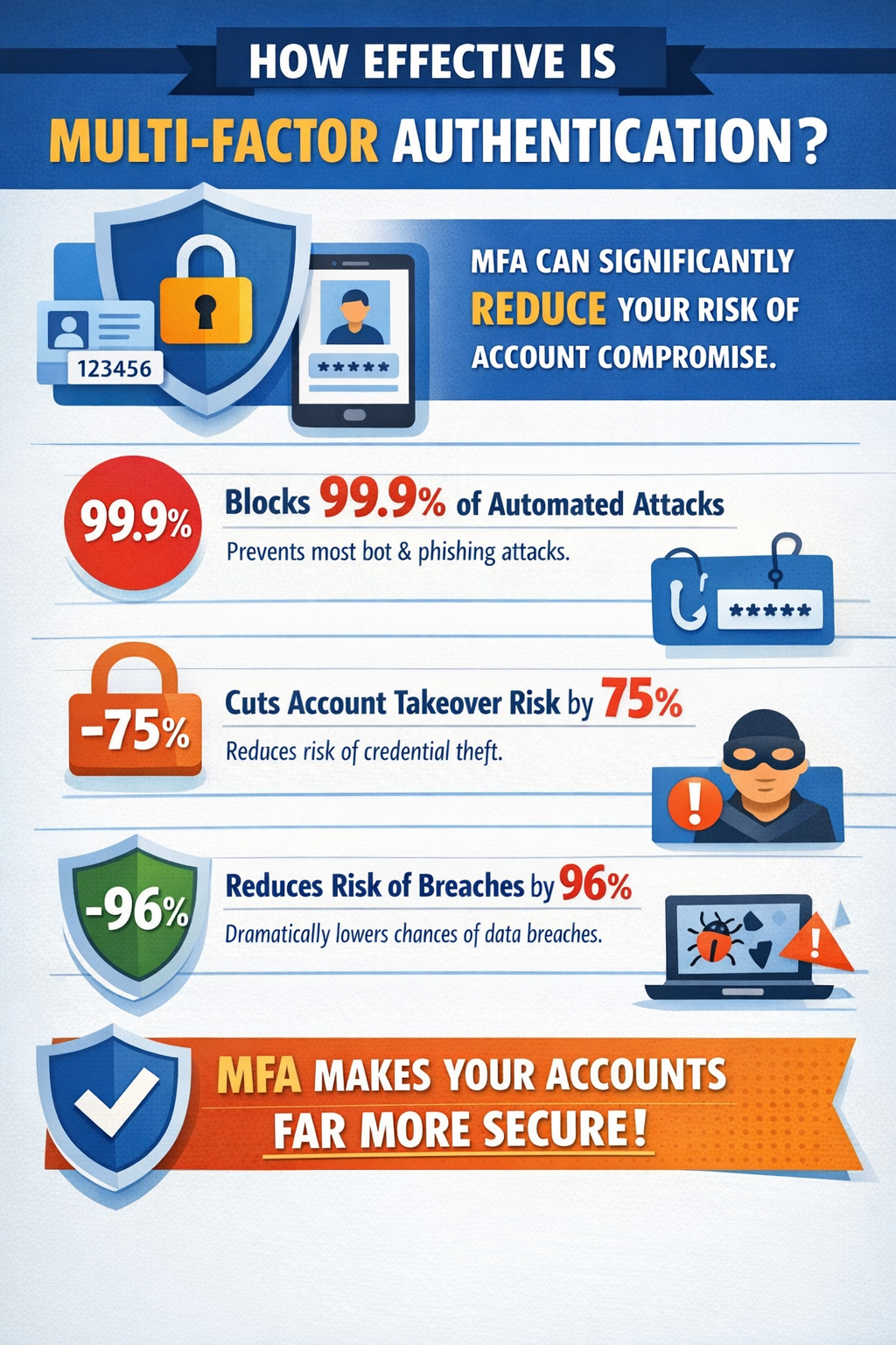 - Prevent Data Breaches – Credential theft is one of the leading causes of data breaches. Multi-factor authentication alone can prevent 99.9% of automated attacks, according to Microsoft. By requiring a second verification method, you can stop the threat actors even if they have stolen your password.